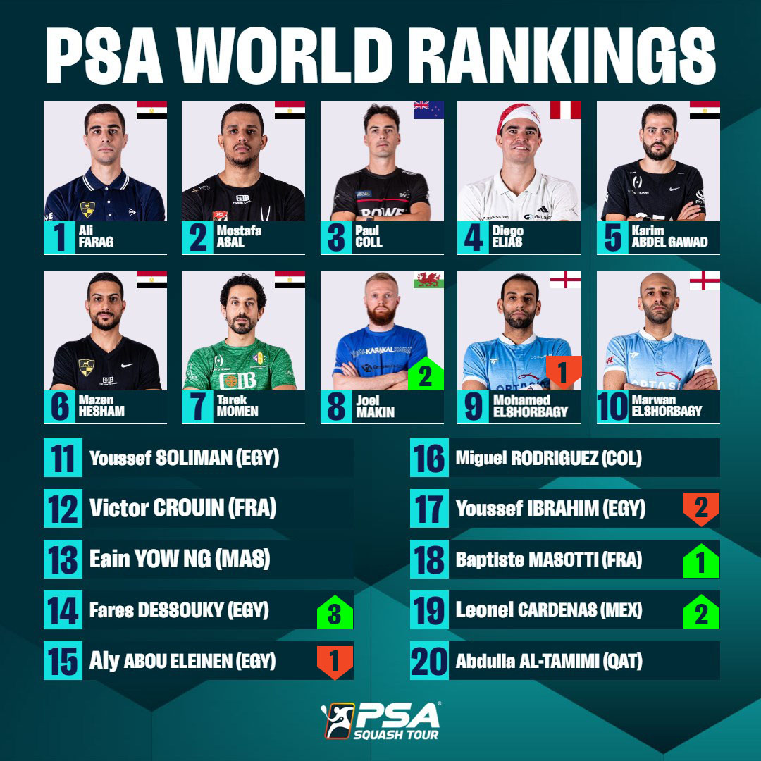 الإسكواش، علي فرج يتصدر التصنيف العالمي ومصطفى عسل في الوصافة