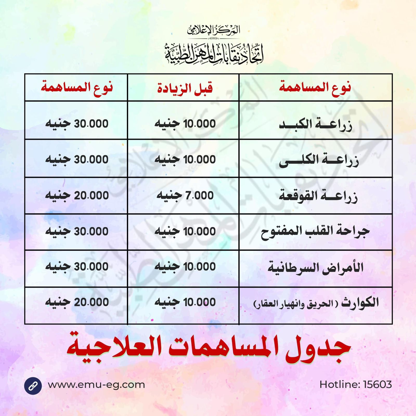 وأوضح أمين عام الاتحاد أنه تم رفع المساهمة في حالات زراعة الكبد والكلى وجراحات القلب المفتوح والأمراض السرطانية من 10 آلاف جنيه إلى 30 ألف جنيه، كما تم رفع المساهمة في حالات زراعة القوقعة من 7 آلاف جنيه إلى 20 ألف جنيه، إضافة إلى المساهمة في حالات الكوارث والتي تشمل الحريق أو انهيار عقار إلى 20 ألف جنيه.