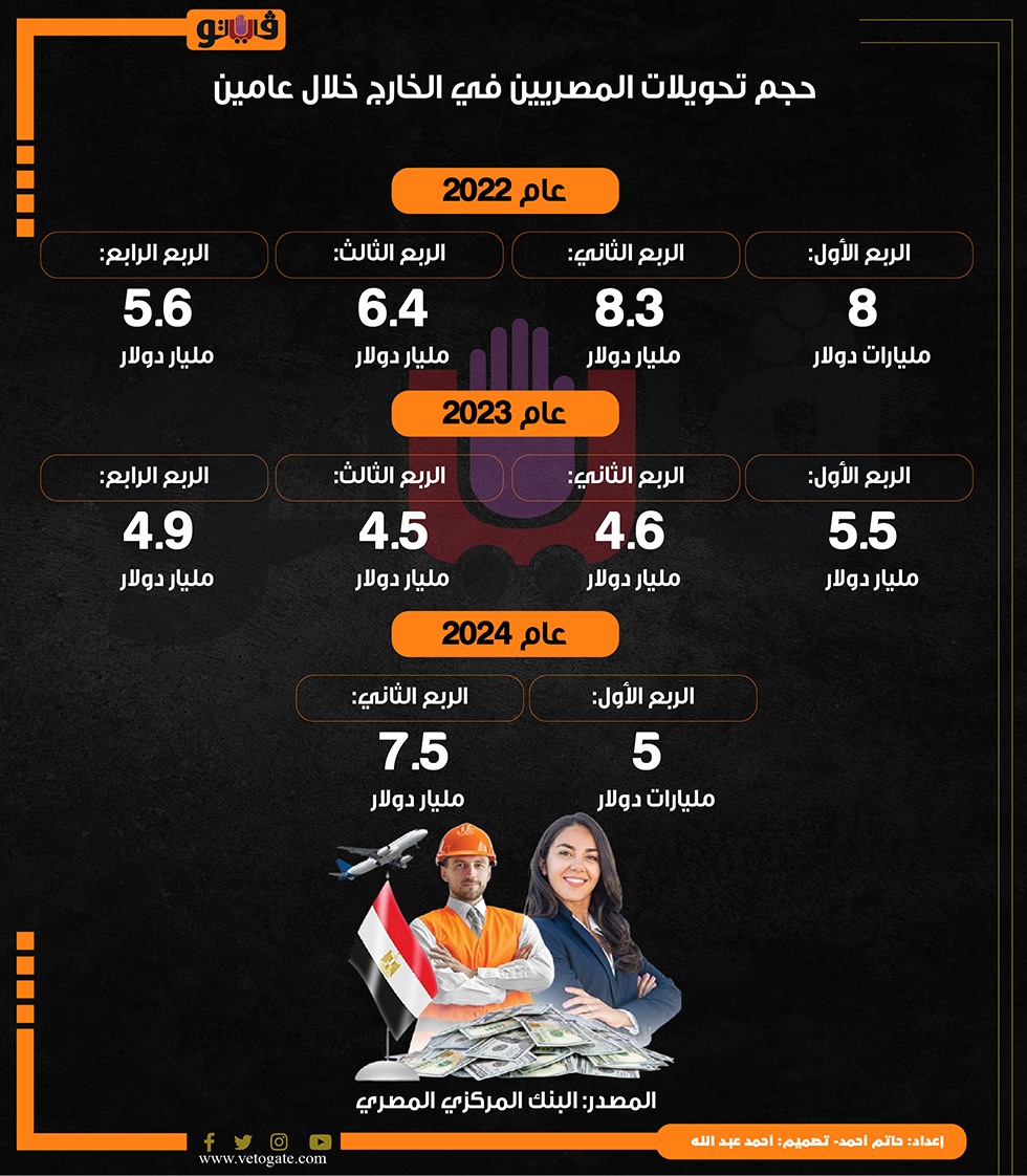 حجم تحويلات المصريين في الخارج خلال عامين (إنفوجراف) الإثنين 14/أكتوبر/2024 - 03:01 م 10/14/2024 3:01:21 PM تحويلات المصريين بالخارج، فيتو حاتم أحمد شارك طباعة 18 حجم الخط شارك طباعة تحويلات المصـريين حجم تحويلات المصريين تحويلات المصريين في الخارج البنك المركزى المصرى