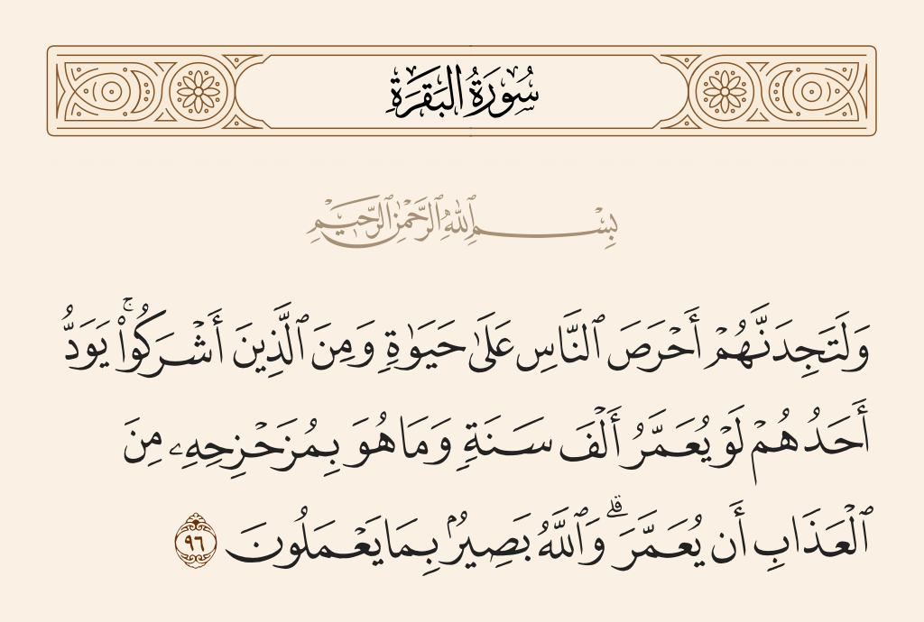 قال تعالى: «وَلَتَجِدَنَّهُمْ أَحْرَصَ النَّاسِ عَلَى حَيَاةٍ وَمِنَ الَّذِينَ أَشْرَكُوا يَوَدُّ أَحَدُهُمْ لَوْ يُعَمَّرُ أَلْفَ سَنَةٍ وَمَا هُوَ بِمُزَحْزِحِهِ مِنَ الْعَذَابِ أَنْ يُعَمَّرَ وَاللَّهُ بَصِيرٌ بِمَا يَعْمَلُونَ».