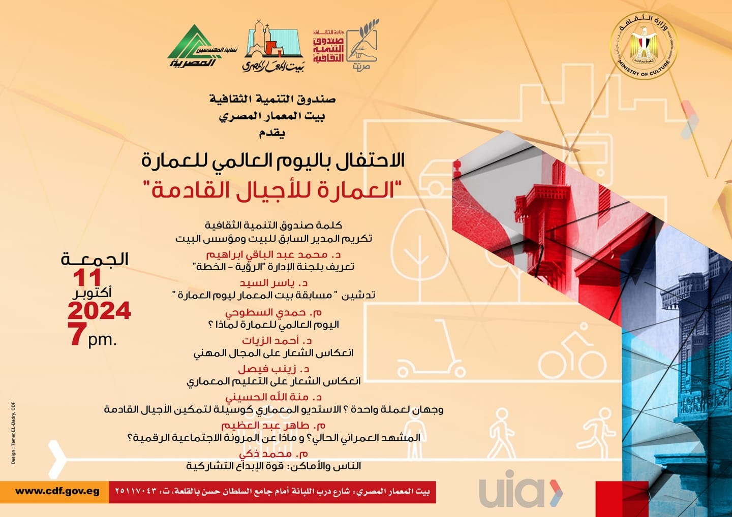 ينظم بيت المعمار المصري بدرب اللبانة بالقلعة، التابع لقطاع صندوق التنمية الثقافية برئاسة المعماري حمدي السطوحي، احتفالية كبرى بمناسبة يوم العمارة العالمي والمعلن من قبل الاتحاد الدولي للمعماريين، تحت عنوان “تمكين الأجيال القادمة”، وذلك في السابعة مساء الجمعة القادم الموافق 11 أكتوبر الجاري.