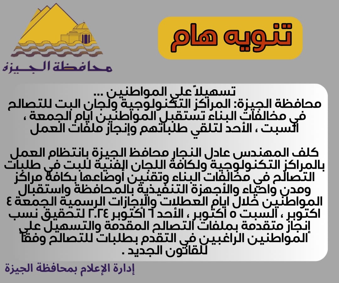 إقبال كبير على المراكز التكنولوجية في الجيزة لتقنين الأوضاع.. تقديم التسهيلات اللازمة لإجراءات التصالح على مخالفات البناء.. وإدراج المخالفات البنائية للإزالة الأسبوع المقبل
