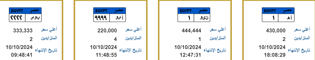 وطرحت لوحات جديدة للمنافسة من بينها؛ لوحة معدنية "أ ه 1" بسعر 430 ألف جنيه، ويتنافس عليها شخصان، فيما طرحت اللوحة "ن ي و1" بسعر 444 ألف جنيه، لوحة معدنية "أ س و9999" بسعر 220 ألف جنيه ويتنافس عليها 4 أشخاص.