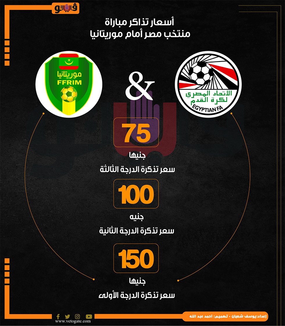 أسعار تذاكر مباراة منتخب مصر أمام موريتانيا (إنفوجراف) الأربعاء 09/أكتوبر/2024 - 01:36 م 10/9/2024 1:36:49 PM منتخب مصر الأول لكرة القدم، فيتو يوسف شعبان شارك طباعة 18 حجم الخط شارك طباعة منتخب مصر اتحاد الكرة منتخب مصر الأول لكرة القدم المنتخب الموريتاني التصفيات المؤهلة لكأس الأمم الإفريقية 2025