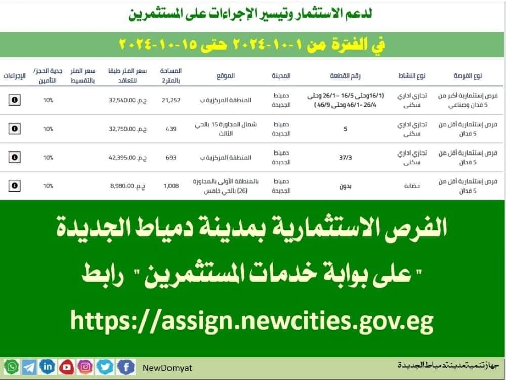 أهم الفرص الاستثمارية بنظام الإتاحة بدمياط الجديدة خلال شهر أكتوبر