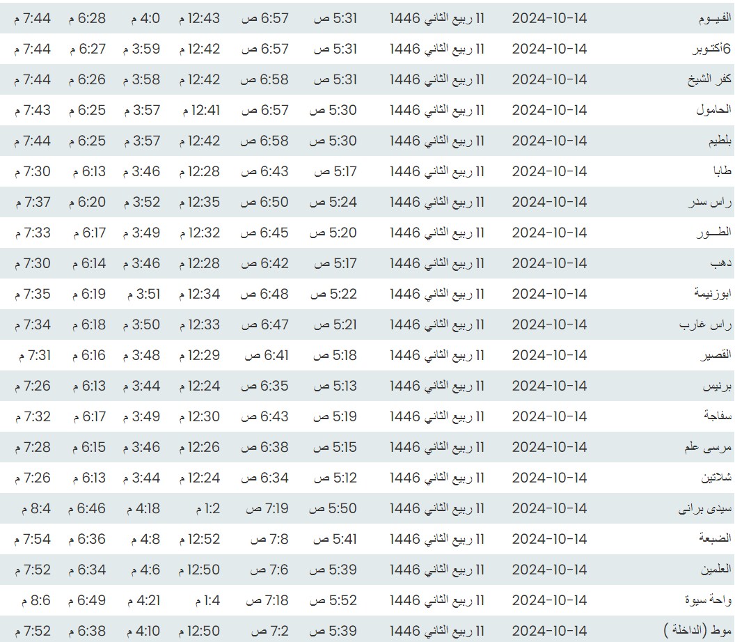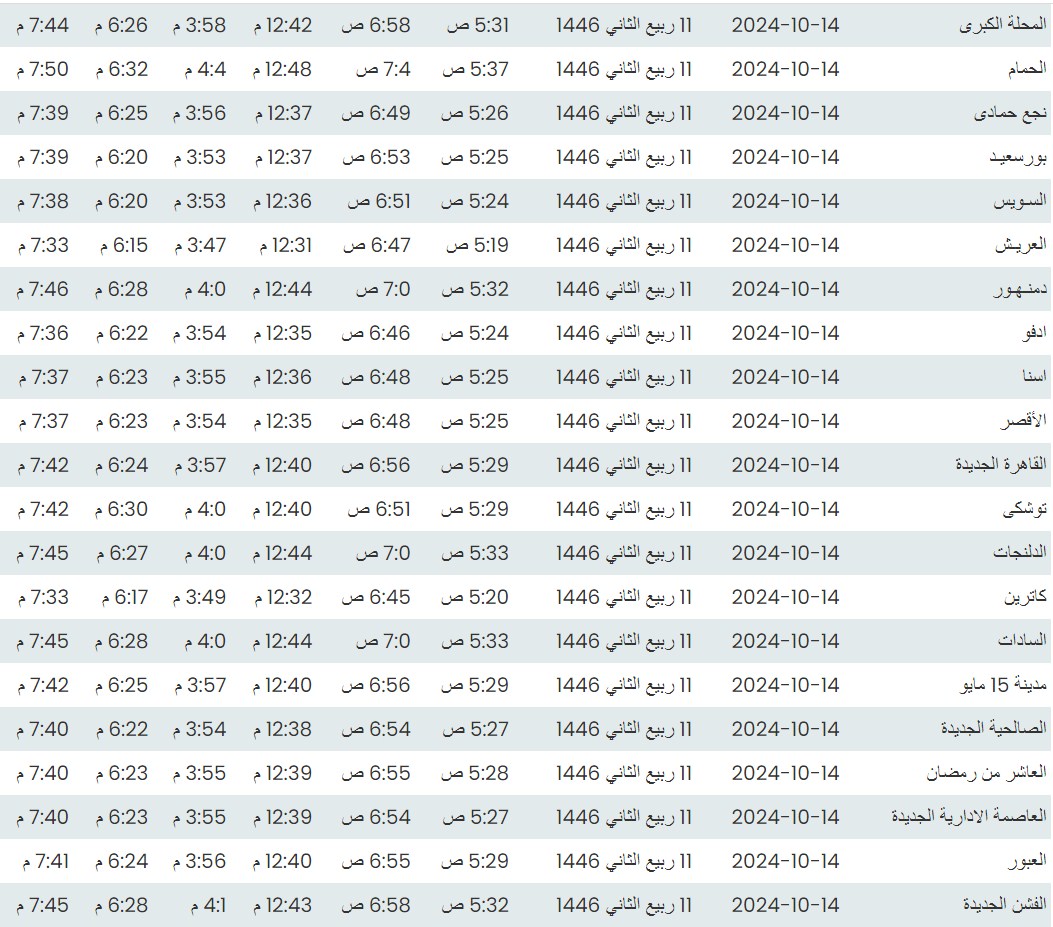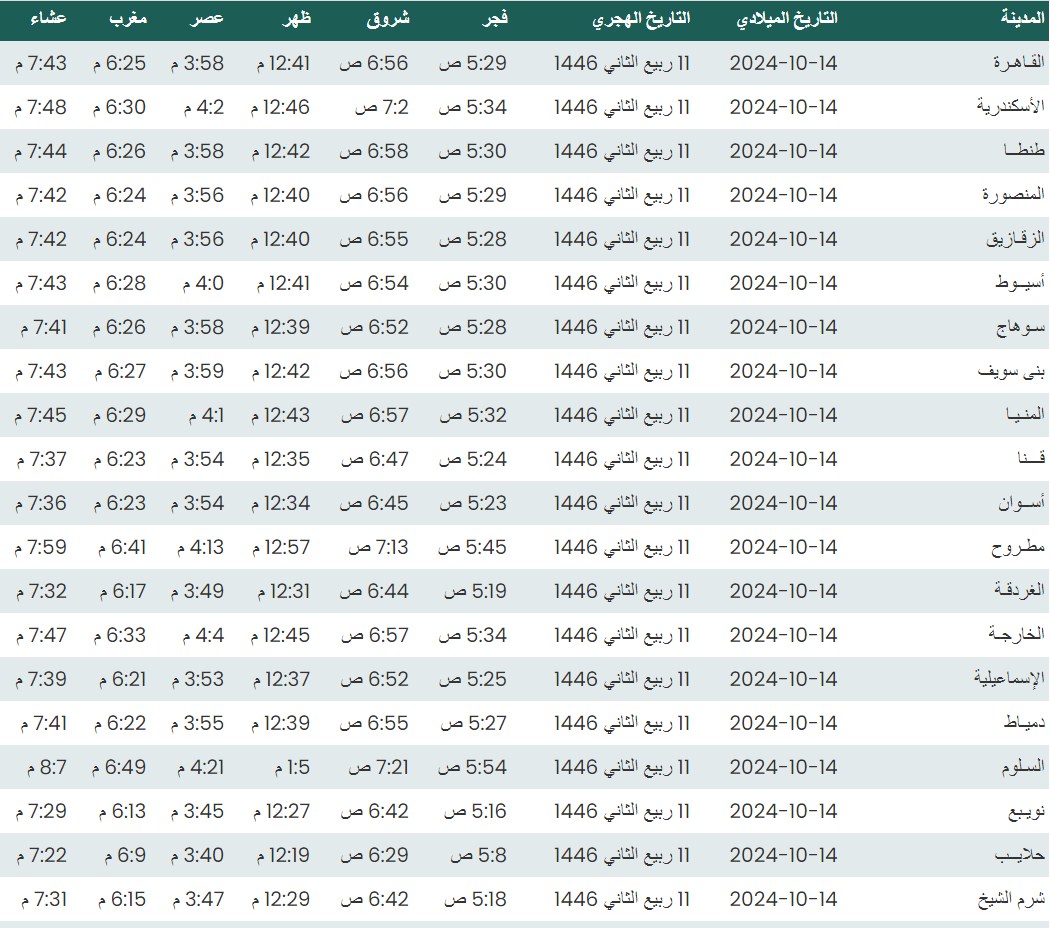 وفيما يلي مواقيت الصلاة، لعدد من مدن ومحافظات الجمهورية من واقع بيانات الهيئة العامة للمساحة
