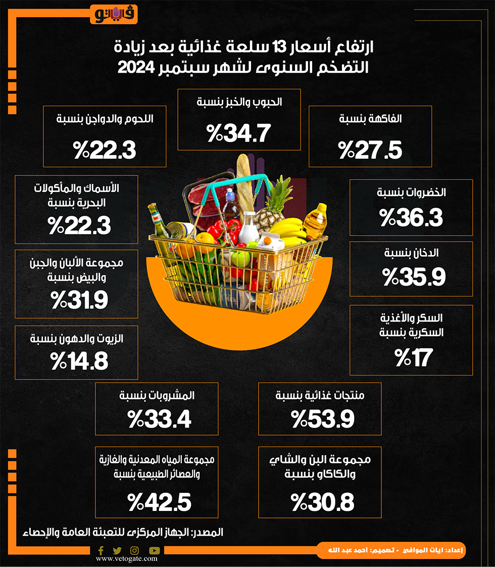 ارتفاع أسعار 13 سلعة غذائية بعد زيادة التضخم السنوى لشهر سبتمبر 2024 (إنفوجراف) الأربعاء 09/أكتوبر/2024 - 04:01 م 10/9/2024 4:01:06 PM سلع غذائية، فيتو آيات الموافى شارك طباعة 18 حجم الخط شارك طباعة ارتفاع أسعار السلع الغذائية ارتفاع أسعار مجموعة الحبوب الخضروات اسعار اللحوم والدواجن الجهاز المركزى للتعبئة العامة والإحصاء