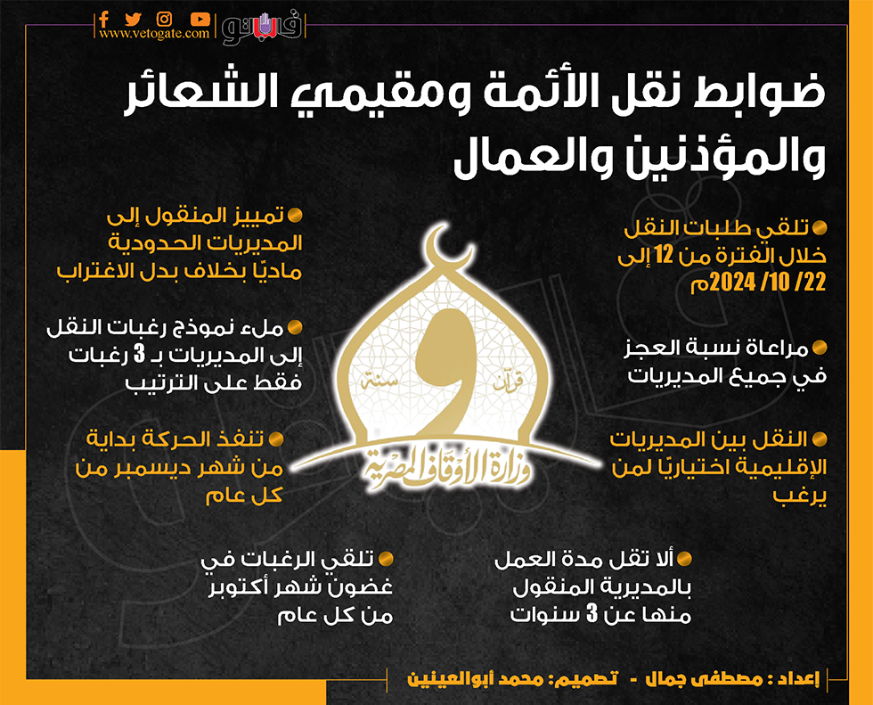 ضوابط نقل الأئمة ومقيمي الشعائر والمؤذنين والعمال (إنفو جراف) الجمعة 11/أكتوبر/2024 - 02:57 م 10/11/2024 2:57:22 PM ضوابط نقل الأئمة ومقيمي الشعائر، فيتو مصطفى جمال شارك طباعة 18 حجم الخط شارك طباعة الأوقاف بدل الاغتراب تنقلات الأئمة ومقيمي الشعائر المديريات الحدودية مقيمي الشعائر
