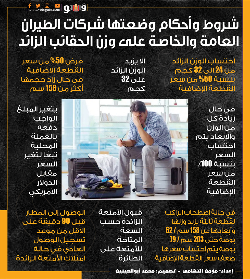 شروط وأحكام وضعتها شركات الطيران العامة والخاصة على وزن الحقائب الزائد (إنفوجراف) السبت 26/أكتوبر/2024 - 09:30 ص 10/26/2024 9:30:22 AM حقائب السفر، فيتو - مؤمن التهامي شارك طباعة 18 حجم الخط شارك طباعة الامتعة الزائدة سعر القطعة الإضافية شركات الطيران وزن الحقائب وزن الحقائب الزائد الوزن الزائد