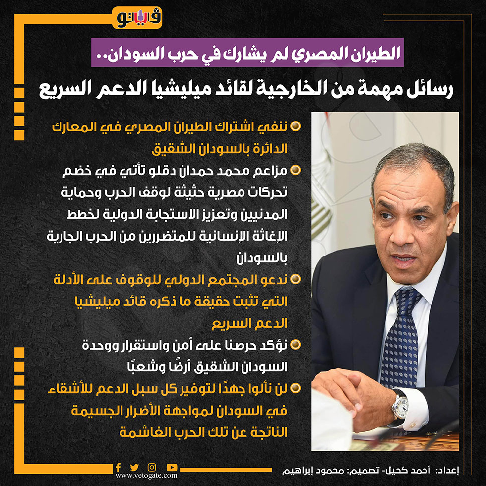 الطيران المصري لم يشارك في حرب السودان.. رسائل مهمة من الخارجية لقائد ميليشيا الدعم السريع (إنفوجراف) الخميس 10/أكتوبر/2024 - 01:03 م 10/10/2024 1:03:21 PM أحمد كحيل شارك طباعة 18 حجم الخط شارك طباعة الدعم السريع السودان الطيران المصري حمد حمدان دقلو حمدان دقلو ميليشيا الدعم السريع وقف الحرب