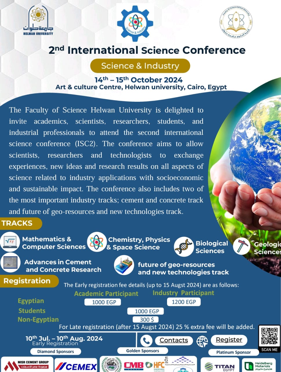 تنظم كلية العلوم بـ جامعة حلوان المؤتمر الدولي الثاني بعنوان "العلوم والصناعة"، وذلك في الفترة من 14 إلى 15 أكتوبر 2024 بمجمع الثقافة والفنون بالجامعة.