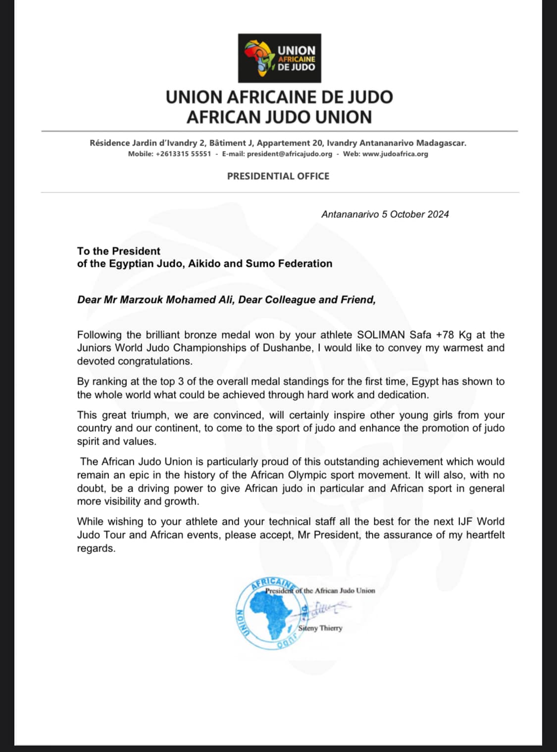وأكمل الخطاب: "نحن مقتنعون بأن هذا الانتصار العظيم سيكون مصدر إلهام بالتأكيد لفتيات أخريات من بلدكم وقارتنا للانضمام إلى رياضة الجودو وتعزيز روح وقيم الجودو".