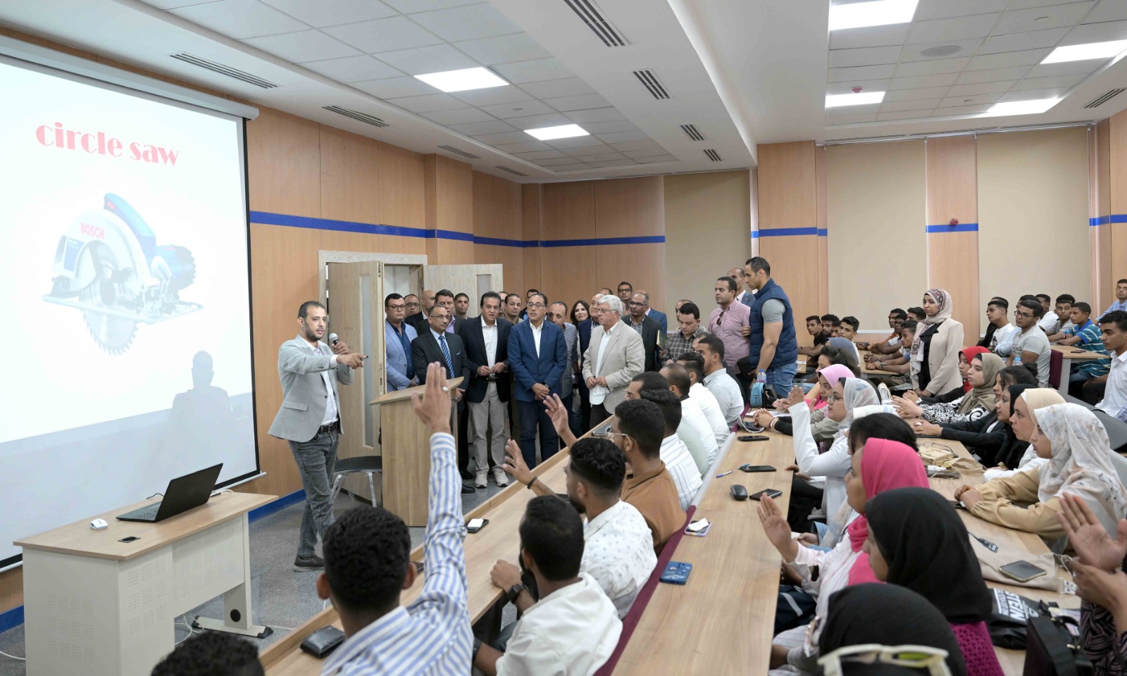وحرص الدكتور مصطفى مدبولي، على معرفة الفرص التي تتيحها الجامعة للفتيات، حيث أشارت إحدى الفتيات إلى أنها من محافظة أسوان، وأن الجامعة تتيح لهن دراسة أسس التصميم كما تؤهلهم لمراحل متقدمة تصل إلى التنفيذ، كما توفر الجامعة برامج لتعليم السلامة والصحة المهنية، وهي تخصص مهم بالجامعة، بينما لفت أحد الشباب إلى أن الجامعة تتيح للشباب فرصًا للتدريب العملي في الورش، واستعرض جانبًا من فرص التدريب التي تقدمها الجامعة، في مجالات مهمة تساعد الطلاب في تهيئة كافة الفرص، وتؤهلهم لفرص العمل.
