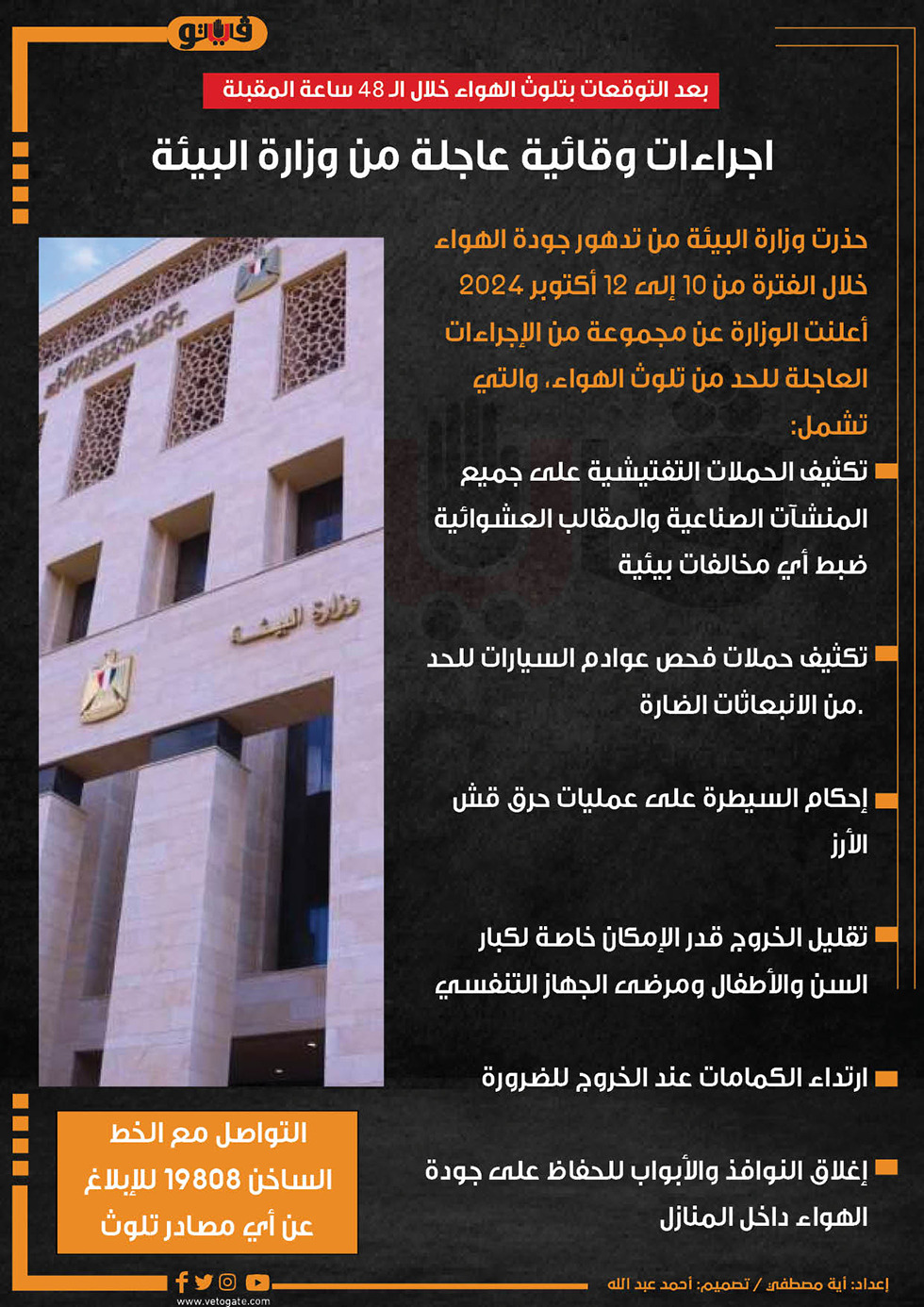 بعد التوقعات بتلوث الهواء خلال الـ 48 ساعة المقبلة، إجراءات وقائية عاجلة من وزارة البيئة (إنفوجراف) الجمعة 11/أكتوبر/2024 - 12:48 ص 10/11/2024 12:48:24 AM وزارة البيئة، فيتو آية مصطفى شارك طباعة 18 حجم الخط شارك طباعة وزارة البيئة مرضى الجهاز التنفسي تلوث الهواء جودة الهواء ارتداء الكمامات