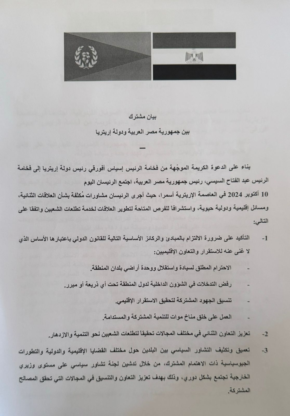 وعقب اللقاء أصدرت مصر وإريتريا بيانًا مشتركًا، فيما يلي نصه: