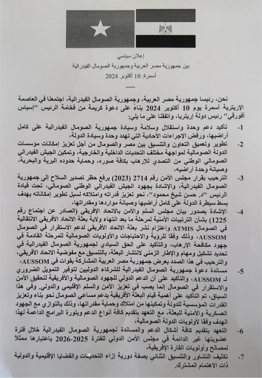 مصر والصومال يصدران إعلانا سياسيا مشتركا