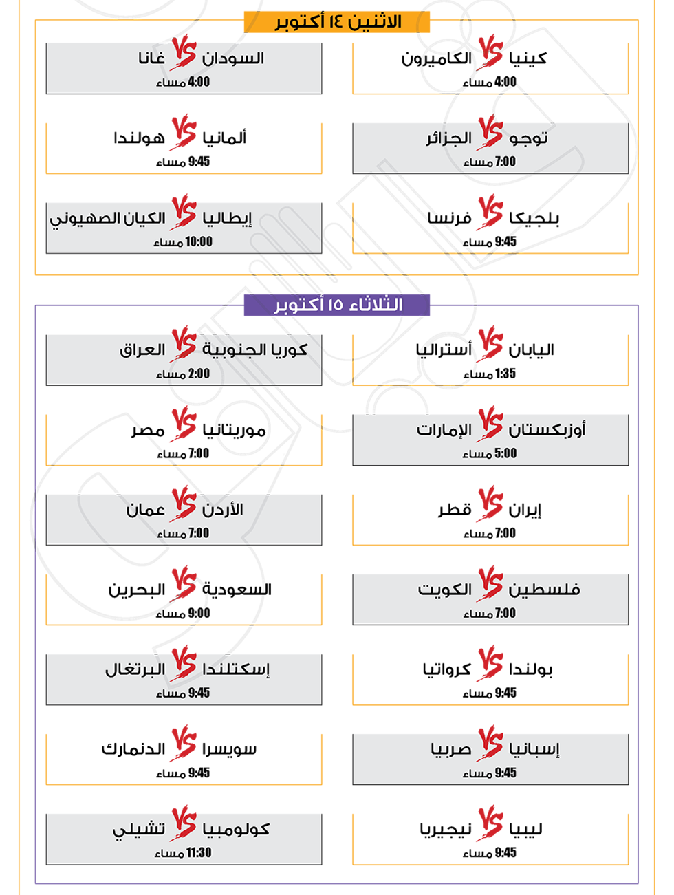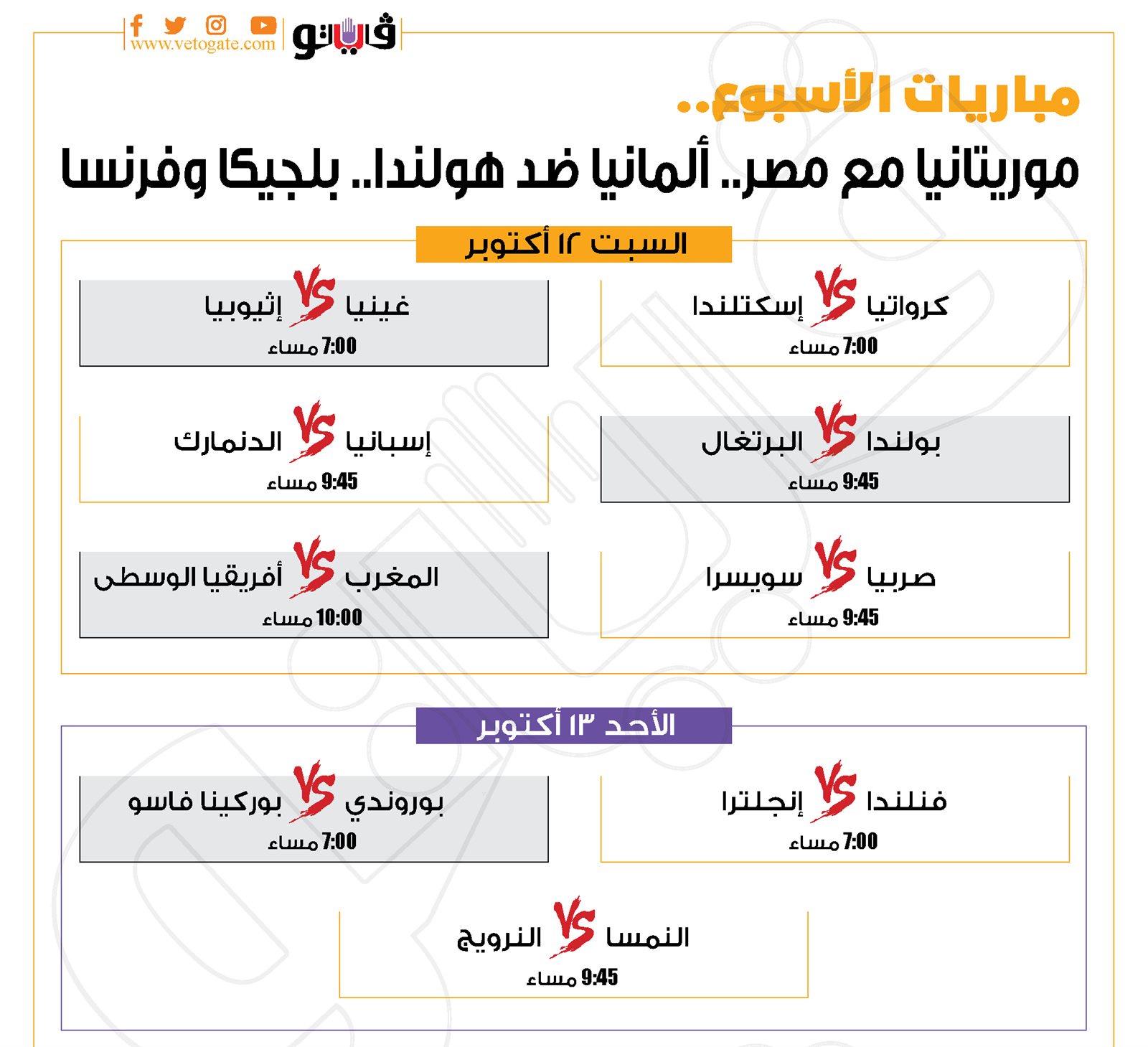 مباريات الأسبوع، موريتانيا مع مصر.. ألمانيا ضد هولندا.. بلجيكا وفرنسا (إنفوجراف) الجمعة 11/أكتوبر/2024 - 05:46 م 10/11/2024 5:46:25 PM منتخب مصر، فيتو محمد سيد شارك طباعة 18 حجم الخط شارك طباعة مصر موريتانيا بلجيكا فرنسا اسبانيا هولندا ألمانيا إيطاليا