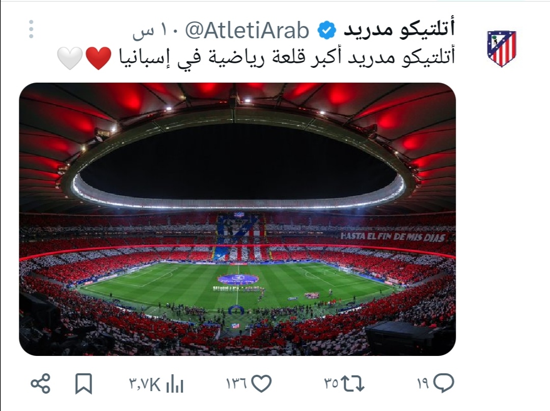 على خطى الزمالك، وصف الحساب الرسمي لنادي أتليتكو مدريد عبر صفحته الرسمية على "X"، ناديه بأنه أكبر قلعة رياضية في إسبانيا.