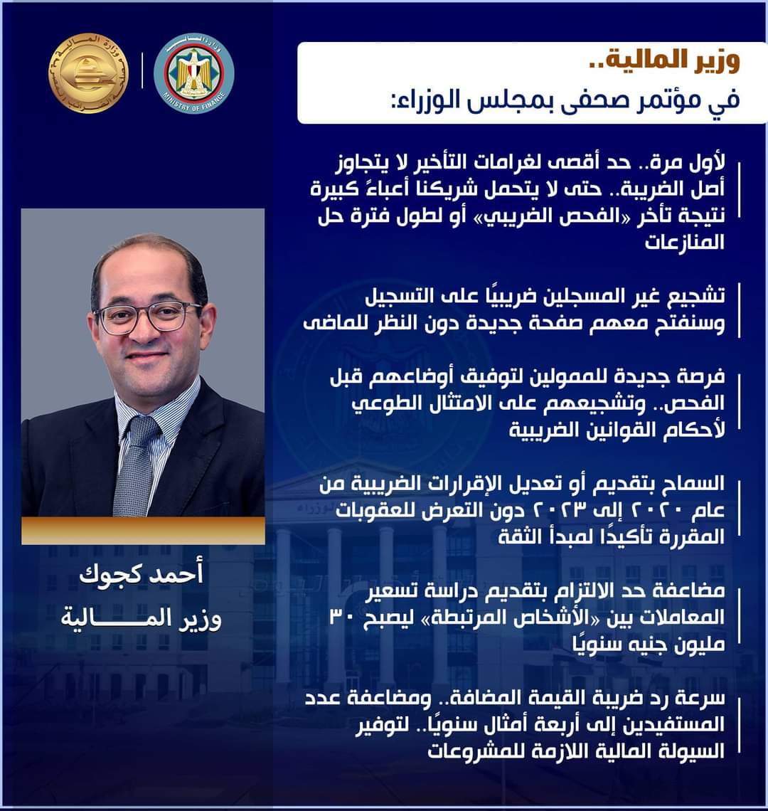أعلن وزير المالية أحمد كجوك تفاصيل الحزمة الأولى للتسهيلات الضريبية، واكد احمد كجوك وزير المالية تعهد المالية بتنفيذها كاملة خلال العام المالي الحالي