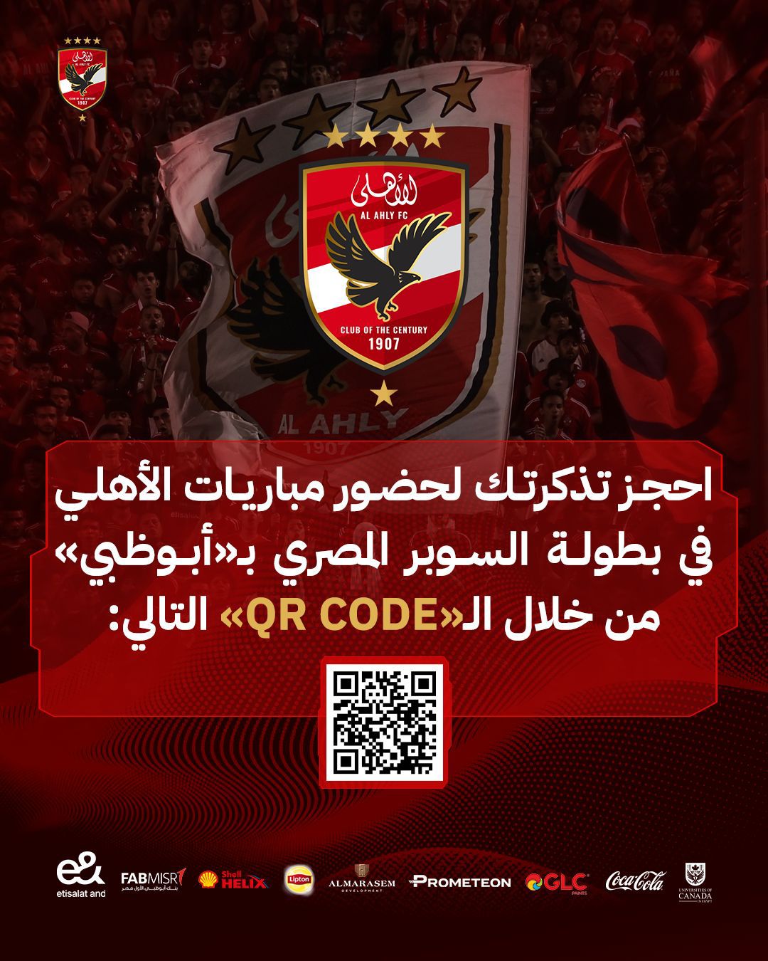 ونشرت صفحة الأهلي صورة لجماهير الفريق وكتبت “احجز تذكرتك لحضور مباريات الأهلي في السوبر المصري بـ أبوظبي من خلال الـ QR CODE ”.