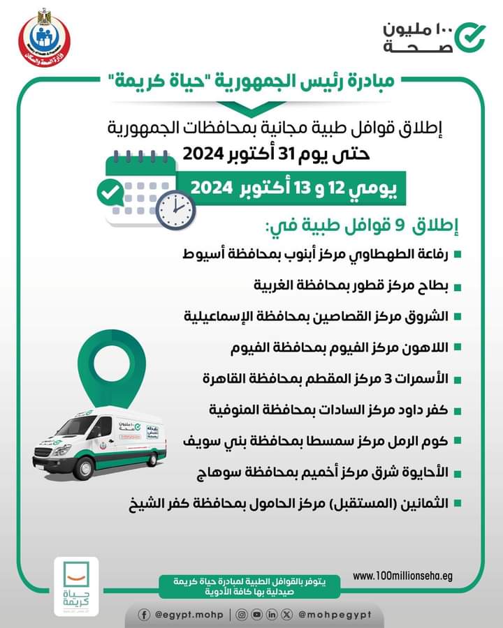 أعلنت وزارة الصحة إطلاق ٩ قوافل طبية ضمن مبادرة رئيس الجمهورية حياة كريمة يومي ١٢ و١٣ أكتوبر للكشف والعلاج مجانًا في التخصصات الطبية نساء وولادة - خدمات تنظيم الأسرة - الأطفال والباطنة - الأنف والأذن والعظام - الجراحة - الرمد الأسنان - القلب - الجلدية وخدمات الأشعة والتحاليل.