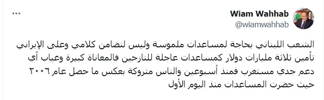 وقال وئام وهاب في رسالته التي وجهها لإيران لـ مساعدة اللبنانيين النازحين: "الشعب اللبناني بحاجة لمساعدات ملموسة وليس لتضامن كلامي وعلى الإيراني تأمين ثلاثة مليارات دولار كمساعدات عاجلة للنازحين"