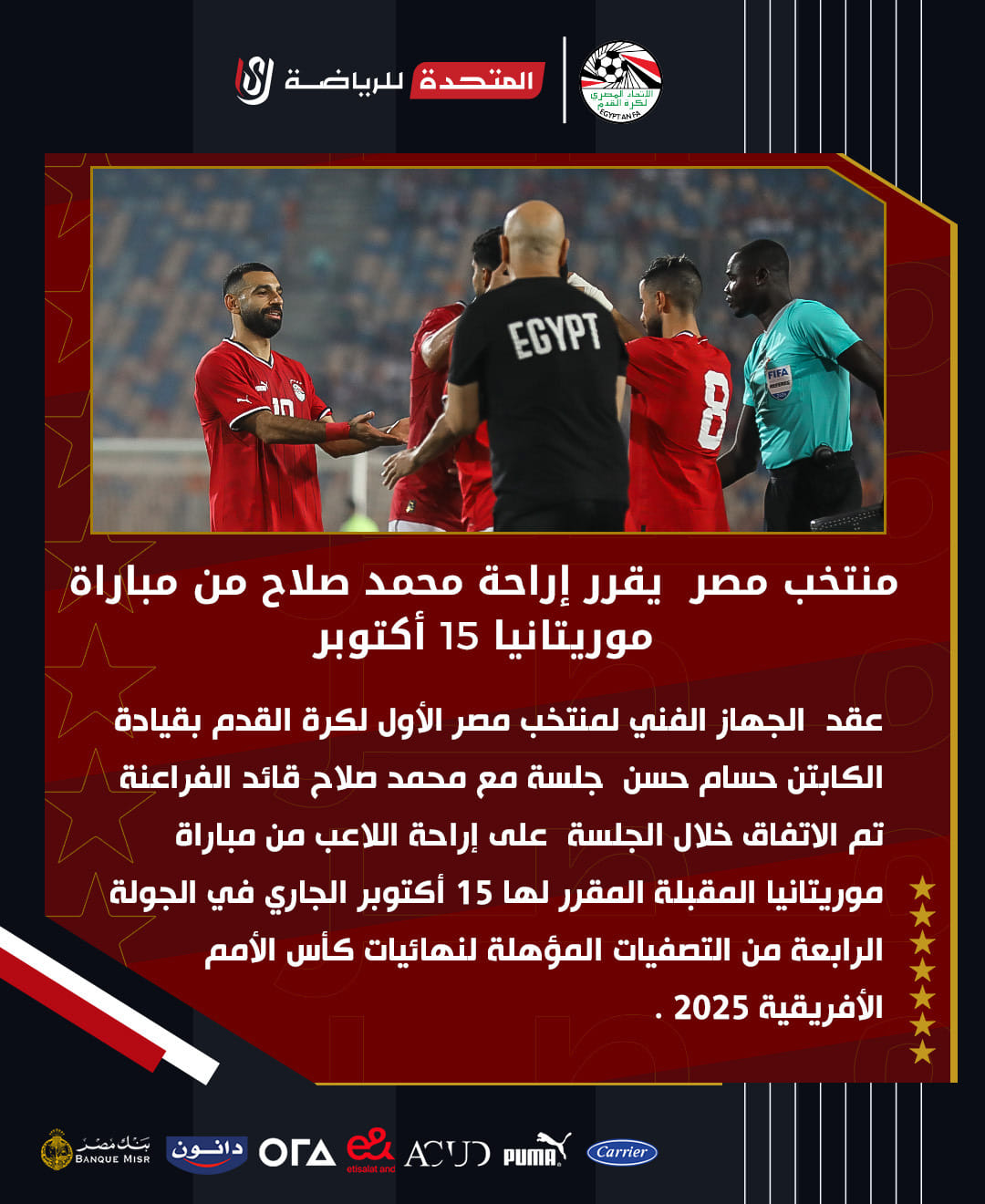 عقد الجهاز الفني لمنتخب مصر الأول لكرة القدم بقيادة الكابتن حسام حسن جلسة مع محمد صلاح قائد الفراعنة وتم الاتفاق خلال الجلسة على إراحة اللاعب من مباراة موريتانيا المقبلة المقرر لها ١٥ أكتوبر الجاري في الجولة الرابعة من التصفيات المؤهلة لنهائيات كأس الأمم الأفريقية ٢٠٢٥.