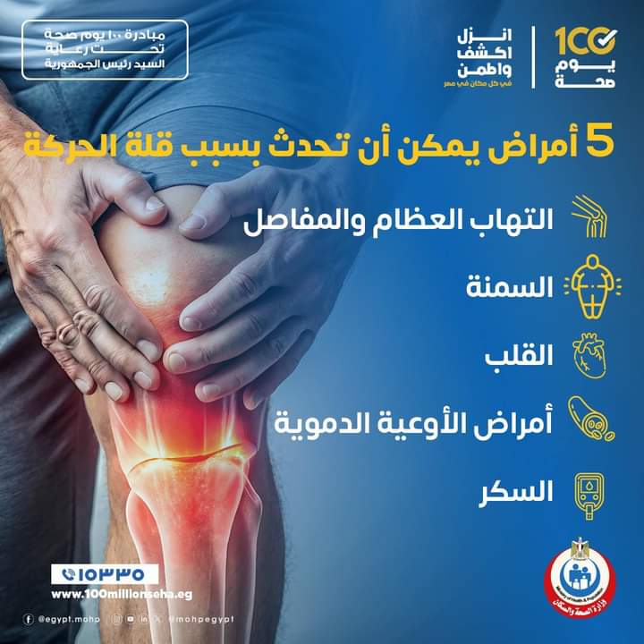 كشفت وزارة الصحة عن أهم 5 أمراض قد تصيب الإنسان بسبب قلة الحركة، وذلك في اليوم العالمي لالتهاب المفاصل.