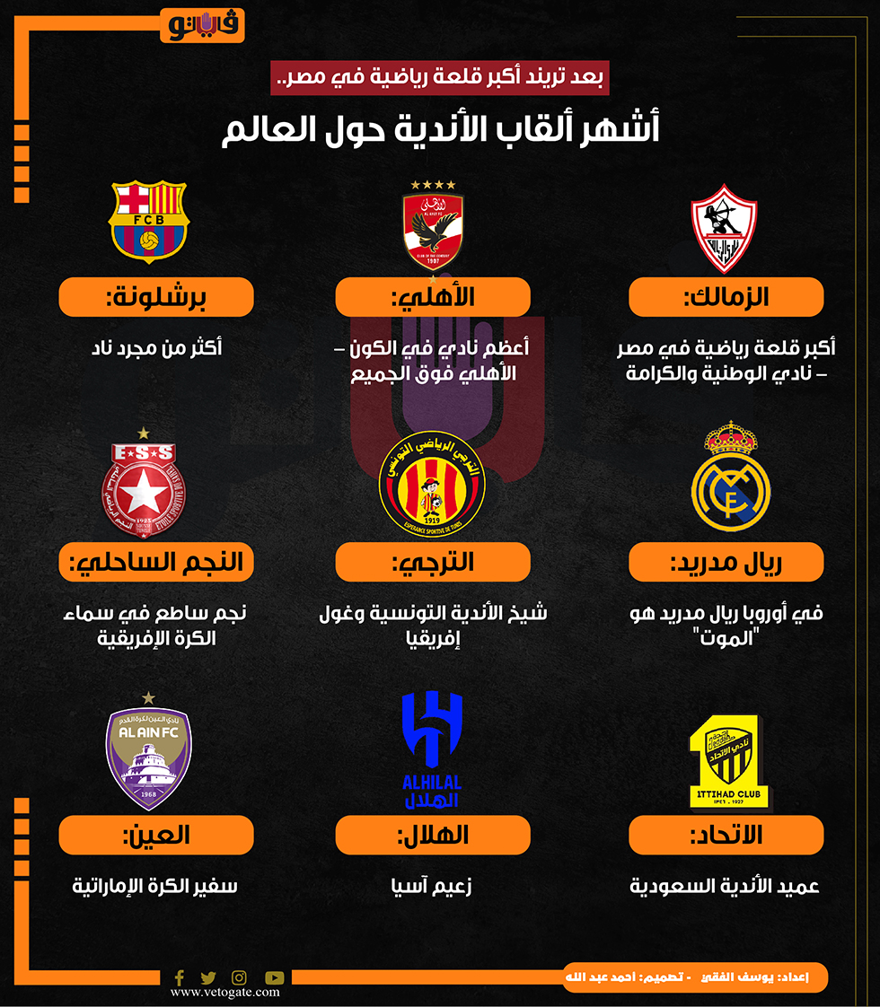 بعد تريند أكبر قلعة رياضية في مصر.. أشهر ألقاب الأندية حول العالم (إنفوجراف) الأحد 13/أكتوبر/2024 - 12:37 م 10/13/2024 12:37:43 PM حسين لبيب يوسف الفقي شارك طباعة 18 حجم الخط شارك طباعة الزمالك نادي الزمالك شعارات الأندية حسين لبيب أكبر قلعة رياضية في مصر