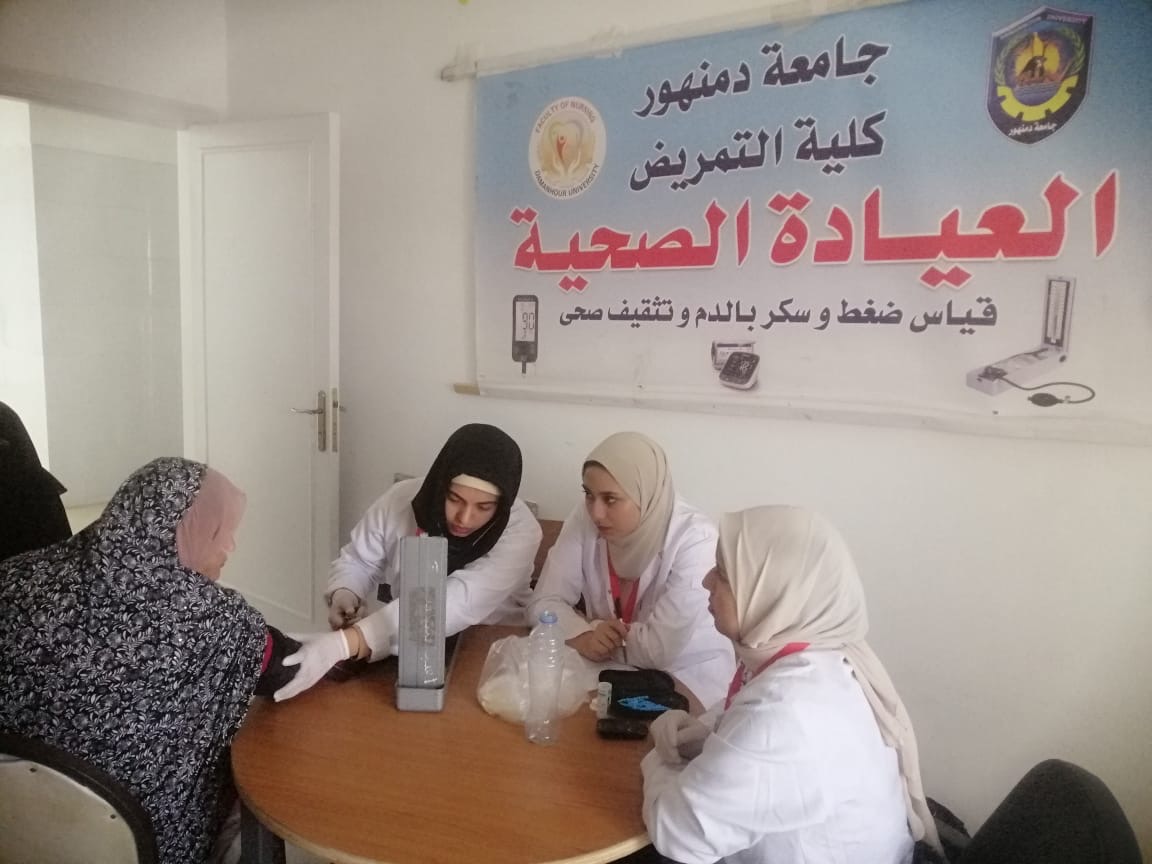 وقامت كلية التمريض بتقديم خدماتها لـ 100 مواطن من خلال مسح صحي بقياس ضغط الدم واكتشاف مرض السكري، وتثقيف صحي لـ 70 سيدة عن سرطان الثدي وطرق اكتشافه، و70 سيدة عن قضية تنظيم الأسرة والوسائل المتاحة وكيفية استخدامها، وتثقيف صحي لـ 70 سيدة عن رعاية الأم الحامل والطفل وجدول تطعيمات الطفل وأهمية الرضاعة الطبيعية، بالإضافة إلى كيفية التعامل مع النزلات المعوية.