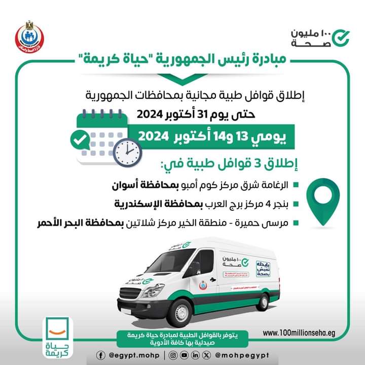 أعلنت وزارة الصحة والسكان إطلاق 3 قوافل طبية ضمن مبادرة رئيس الجمهورية حياة كريمة يومي ١٣ و١٤ أكتوبر للكشف والعلاج مجانًا في التخصصات الطبية