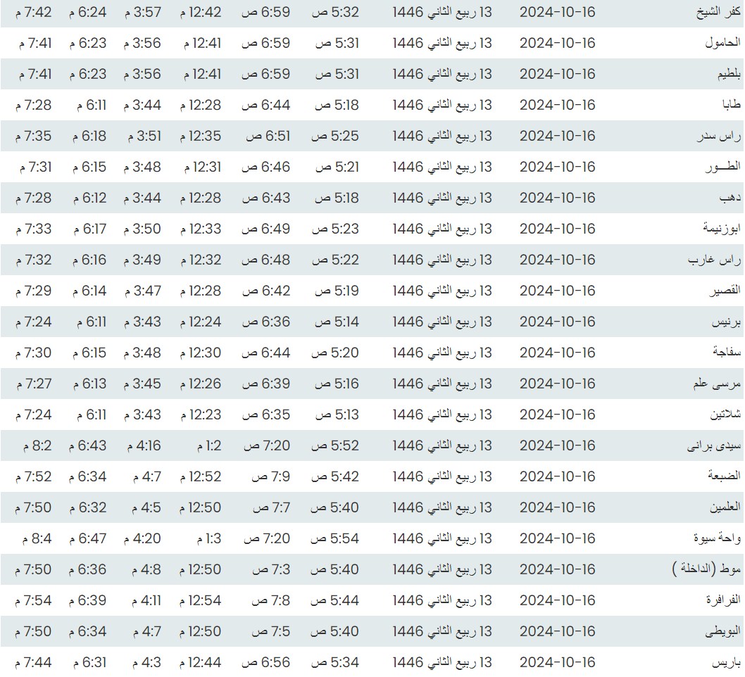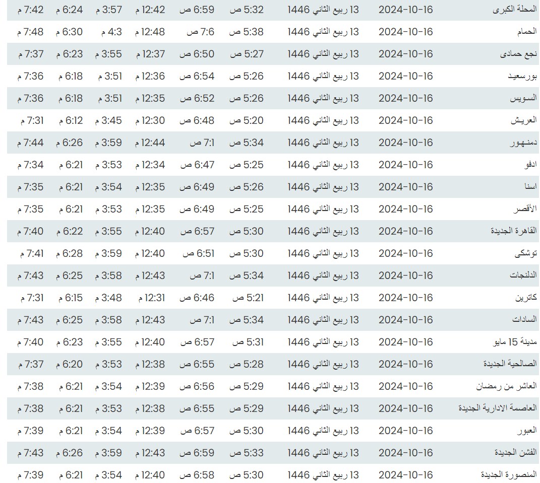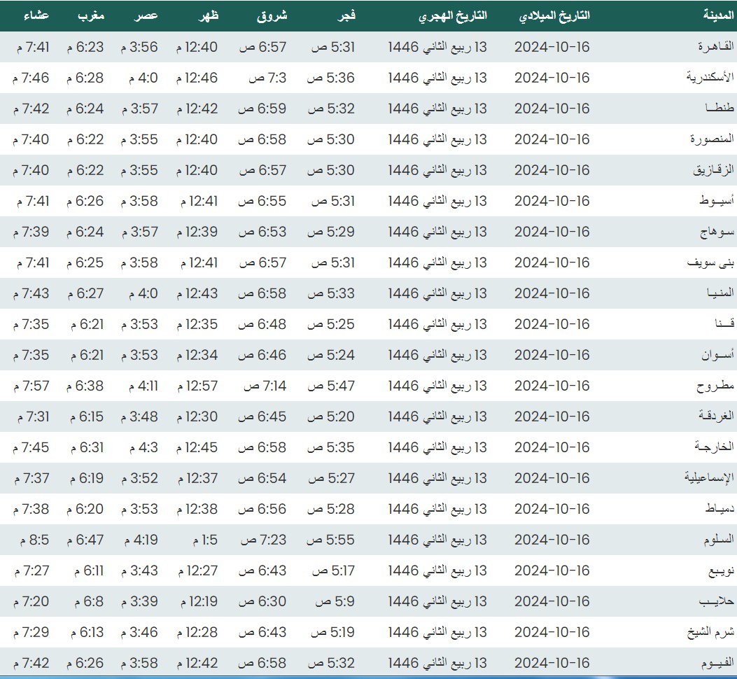 وفيما يلي مواقيت الصلاة، لعدد من مدن ومحافظات الجمهورية من واقع بيانات الهيئة العامة للمساحة