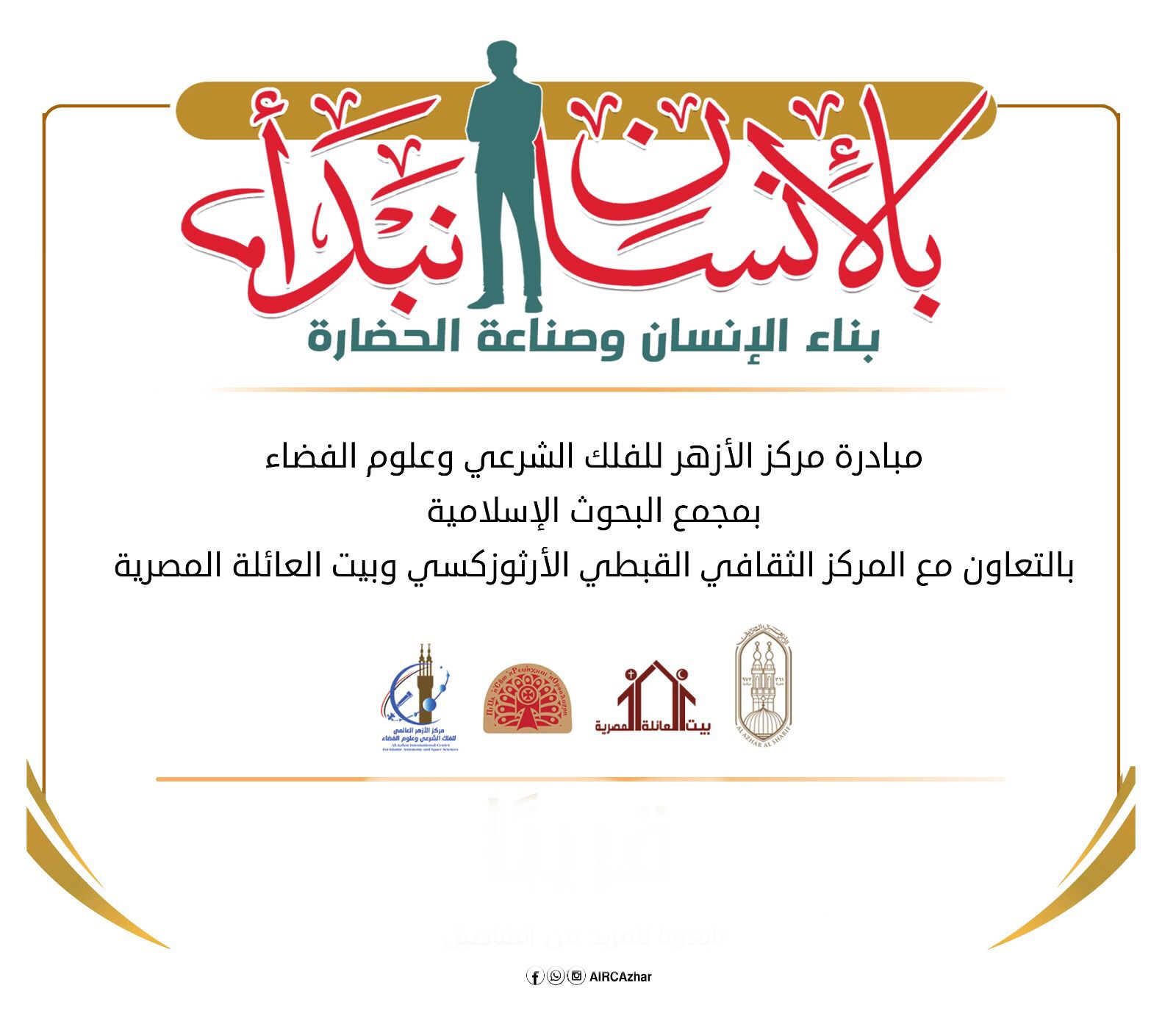 يُطلِق مركز الأزهر العالمي للفلك الشَّرعي وعلوم الفضاء بمجمع البحوث الإسلامية، اليوم الإثنين، مبادرةَ (بالإنسان نبدأ.. بناء الإنسان وصناعة الحضارة)، برعاية كريمة من فضيلة الإمام الأكبر أ.د. أحمد الطيِّب، شيخ الأزهر الشَّريف، وإشراف: فضيلة أ.د. محمد الضويني، وكيل الأزهر ورئيس مركز الأزهر العالمي للفلك الشَّرعي وعلوم الفضاء، وفضيلة أ.د. محمد الجندي، الأمين العام لمجمع البحوث الإسلاميَّة ونائب رئيس المركز.