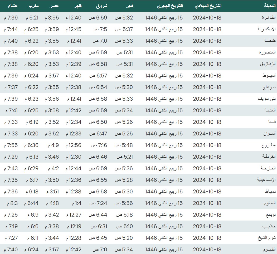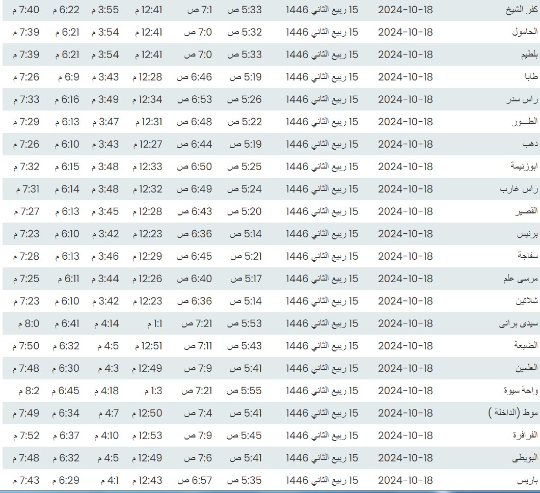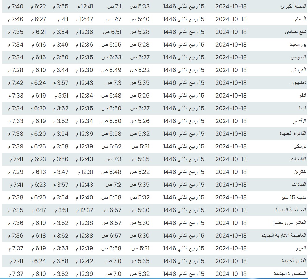 وفيما يلي مواقيت الصلاة، لعدد من مدن ومحافظات الجمهورية من واقع بيانات الهيئة العامة للمساحة