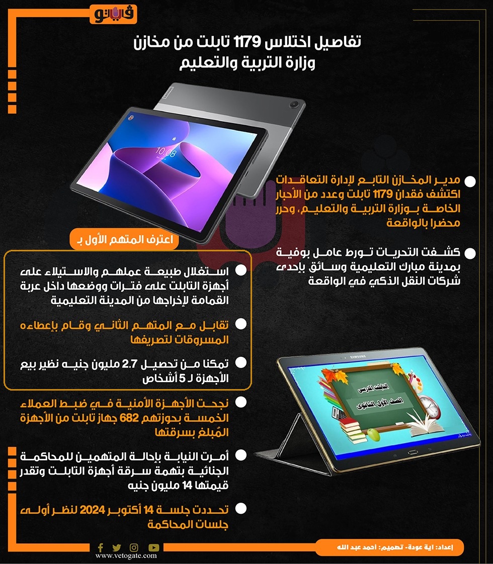 تفاصيل اختلاس 1179 تابلت من مخازن وزارة التربية والتعليم (إنفوجراف) الإثنين 14/أكتوبر/2024 - 01:36 م 10/14/2024 1:36:09 PM محاكمة المتهم، فيتو آية عودة شارك طباعة 18 حجم الخط شارك طباعة التربية والتعليم شركات النقل الذكي وزارة التربية والتعليم محاكمة الجنائية أجهزة التابلت
