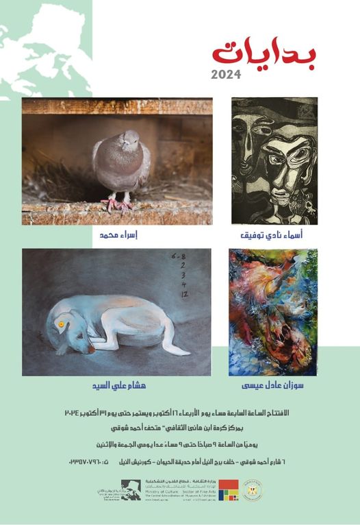 ويشارك فى المعرض كلًا من الفنانات (أسماء نادي توفيق - إسراء محمد - سوزان عادل عيسى) ومعهم الفنان (هشام علي السيد)، وذلك على أن يستمر المعرض حتى يوم الخميس الموافق 31 أكتوبر الجاري بمركز كرمة بن هانئ الثقافي فى متحف أحمد شوقي.