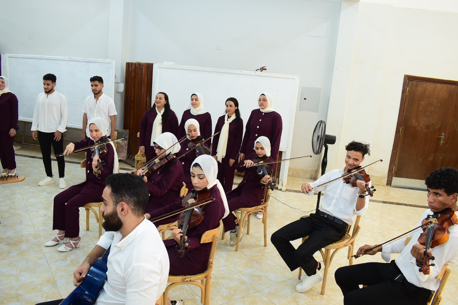 وخلال البروفة قدم فريق الكورال عددًا من الفقرات الفنية الجماعية والفردية، وعددًا من الأغاني الوطنية، والتقط الطلاب مع رئيس الجامعة عددًا من الصور التذكارية.