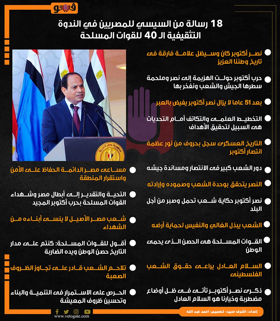 18 رسالة من السيسي للمصريين في الندوة التثقيفية الـ 40 للقوات المسلحة (إنفوجراف) الإثنين 14/أكتوبر/2024 - 06:15 م 10/14/2024 6:15:24 PM أشرف سيد شارك طباعة 18 حجم الخط شارك طباعة التاريخ العسكرى نصر اكتوبر الجيش الشعب الفلسطيني الندوة التثقيفية الـ 40 للقوات المسلحة حرب أكتوبر حقوق الشعب الفلسطيني ذكرى نصر اكتوبر شهداء القوات المسلحة