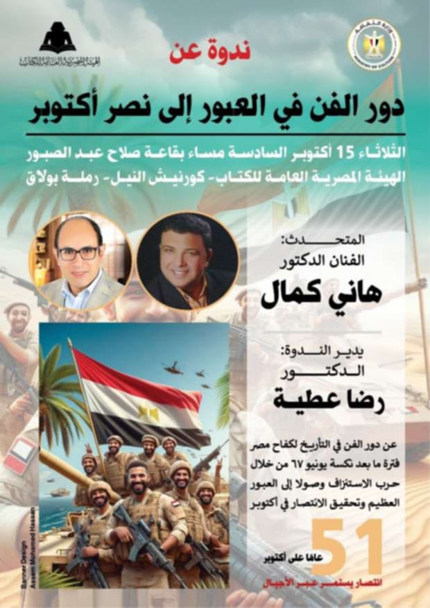 تُقيم الهيئة المصرية العامة للكتاب، برئاسة الدكتور أحمد بهي الدين، في السادسة مساء غدًا الثلاثاء 15 أكتوبر، ندوة بعنوان «دور الفن في العبور إلى نصر أكتوبر»، بقاعة صلاح عبد الصبور.
