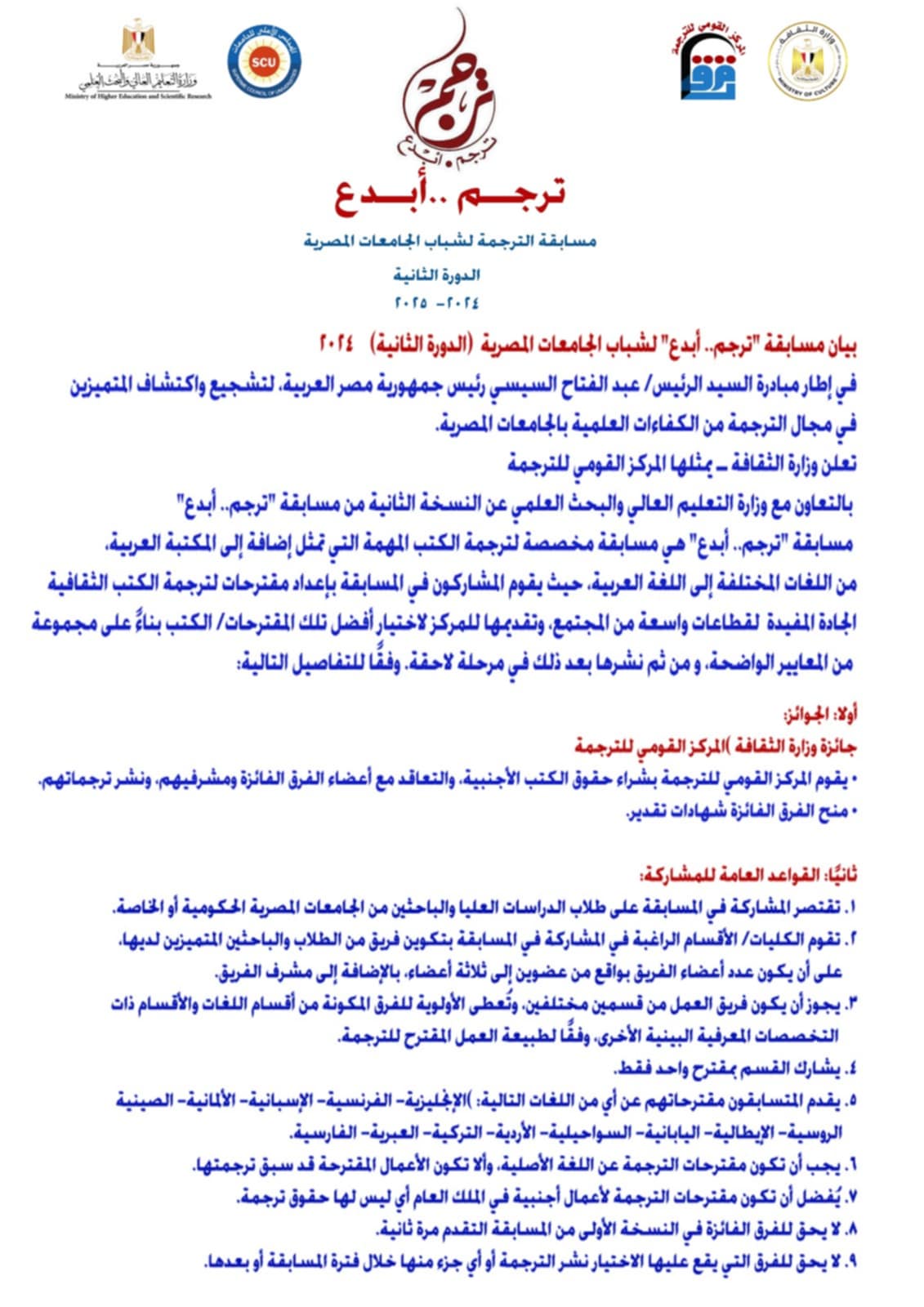 تطلق وزارة الثقافة ويمثلها المركز القومي للترجمة بالتعاون مع وزارة التعليم العالي والبحث العلمي ويمثلها المجلس الأعلى للجامعات - الدورة الثانية من مسابقة "ترجم.. ابدع" (بالتزامن من الاحتفال بذكرى مولد الشيخ رفاعة الطهطاوي).