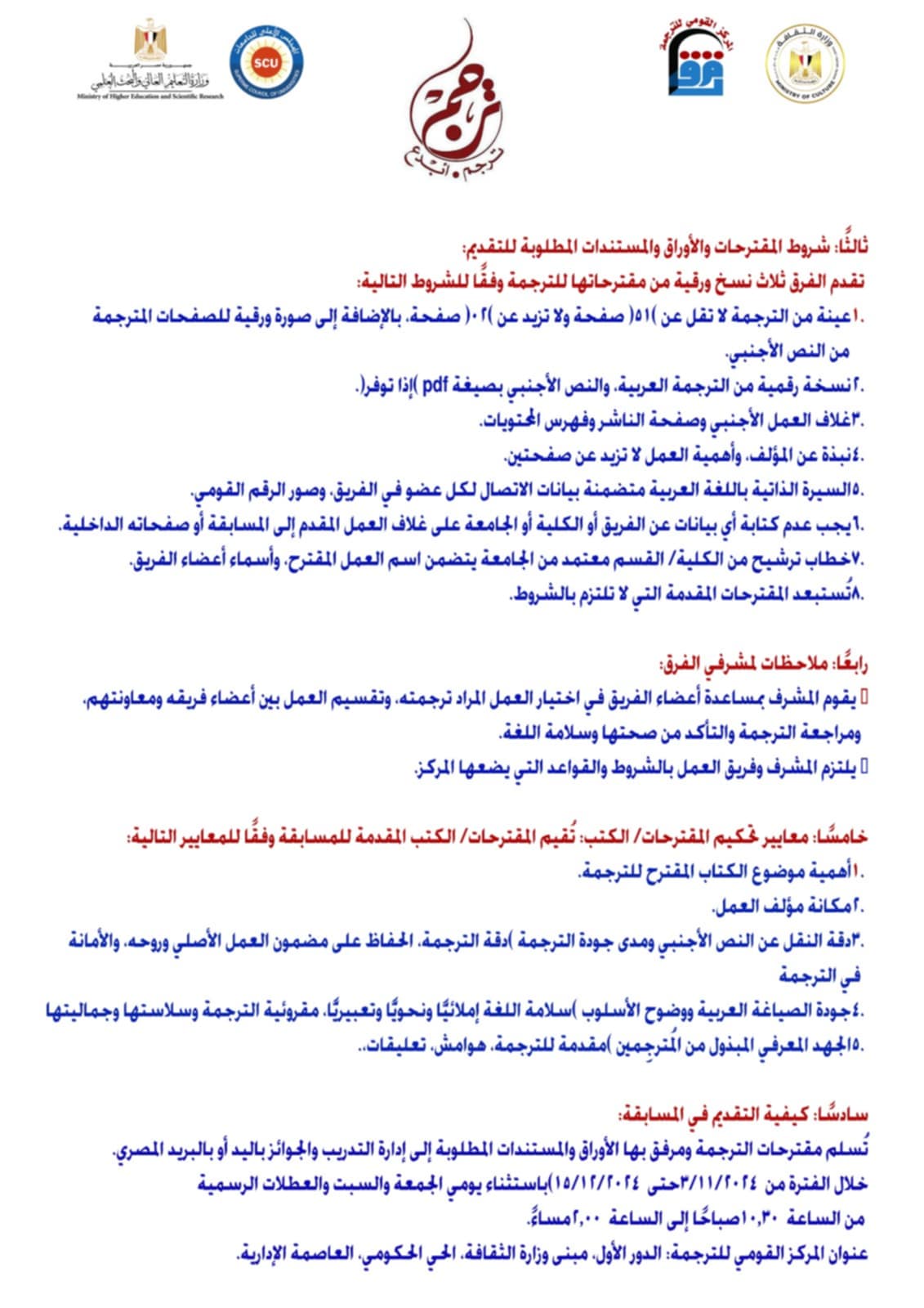 6. يجب أن تكون مقترحات الترجمة عن اللغة الأصلية، وألا تكون الأعمال المقترحة قد سبق ترجمتها.