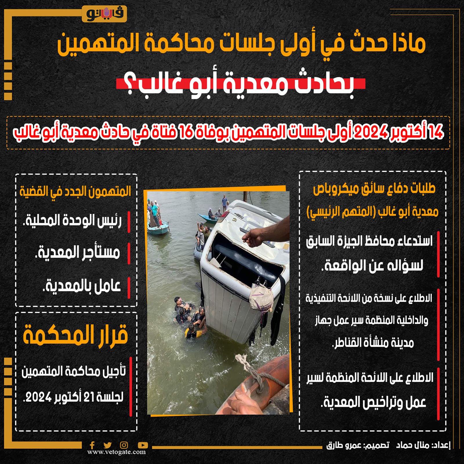 ماذا حدث في أولى جلسات محاكمة المتهمين بحادث معدية أبو غالب؟ (إنفوجراف) الثلاثاء 15/أكتوبر/2024 - 02:55 ص 10/15/2024 2:55:10 AM حادث معدية أبو غالب، فيتو منال حماد تصميم :عمرو طارق شارك طباعة 18 حجم الخط شارك طباعة حادث معدية ابو غالب سائق ميكروباص معدية أبو غالب محافظ الجيزة