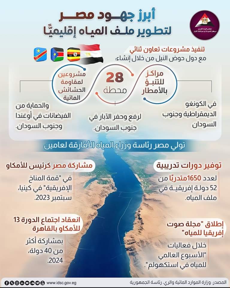 نشرت الصفحة الرسمية لـ مركز المعلومات ودعم اتخاذ القرار بمجلس الوزراء، على موقع التواصل الاجتماعي فيسبوك إنفوجرافًا جديدًا عن (أبرز جهود مصر لتطوير ملف المياه إقليميًّا).