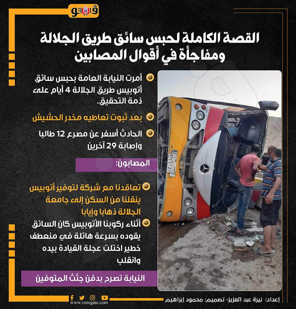 القصة الكاملة لحبس سائق طريق الجلالة ومفاجأة في أقوال المصابين (إنفوجراف) الثلاثاء 15/أكتوبر/2024 - 08:49 م 10/15/2024 8:49:51 PM حادث طريق الجلالة نيرة عبد العزيز شارك طباعة 18 حجم الخط شارك طباعة النيابة العامة اتوبيس طريق الجلالة طريق الجلالة