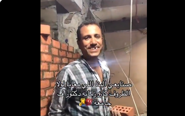وأظهر الفيديو أحد الشباب ويدعى محمد، وهو يقوم بأعمال البناء في أحد المباني، حيث يمارس مهنة عامل بناء، مؤكدًا أنه اضطر لممارسة مهنة عامل البناء لأنه لم يجد عامل في مجال تخصصه، كخبير في العلوم الزراعية تخصص الهندسة الوراثية، ولكنه لا يزال يحاول البحث عن فرصة عمل مناسبة.