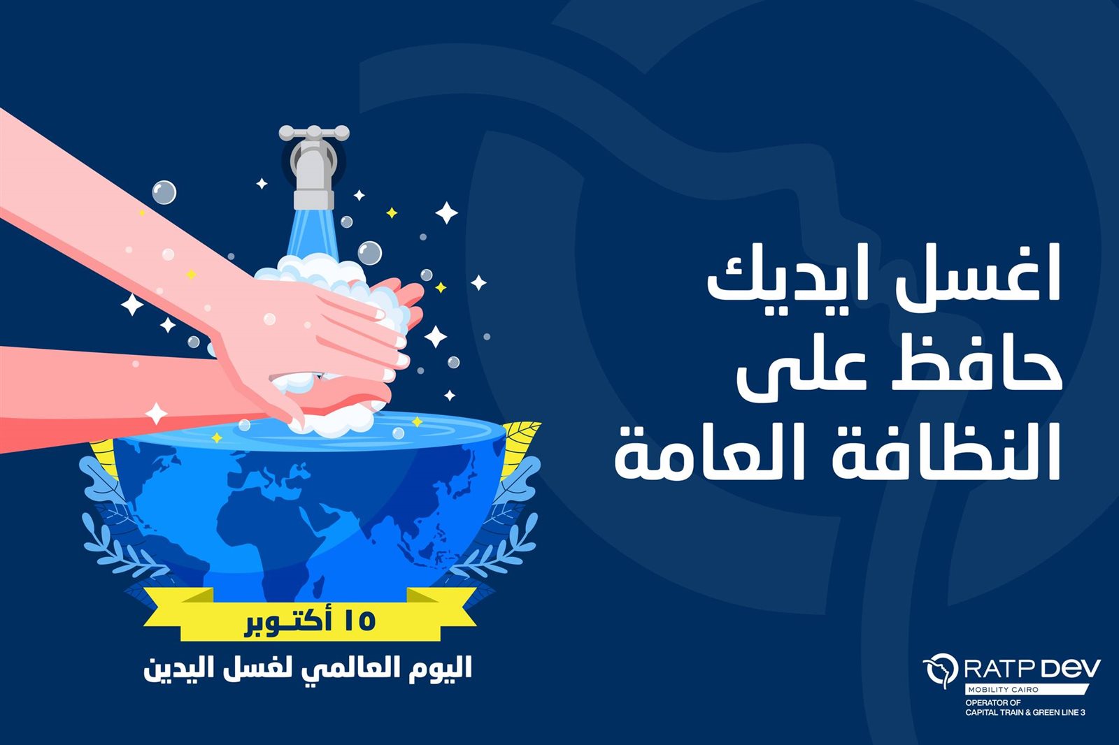 أطلقت الشركة المشغلة للخط الثالث للمترو دعوة للركاب بالمترو والقطار الكهربائى بعنوان: اغسل إيدك قبل ما تركب القطار، وذلك بمناسبة اليوم العالمى للنظافة والحد من انتقال الجراثيم