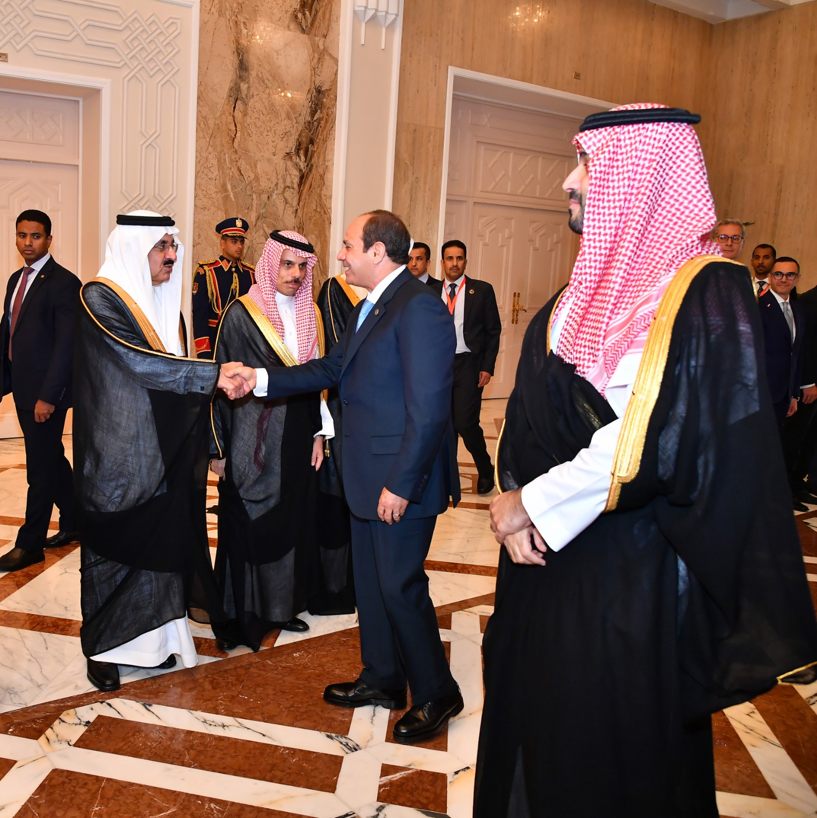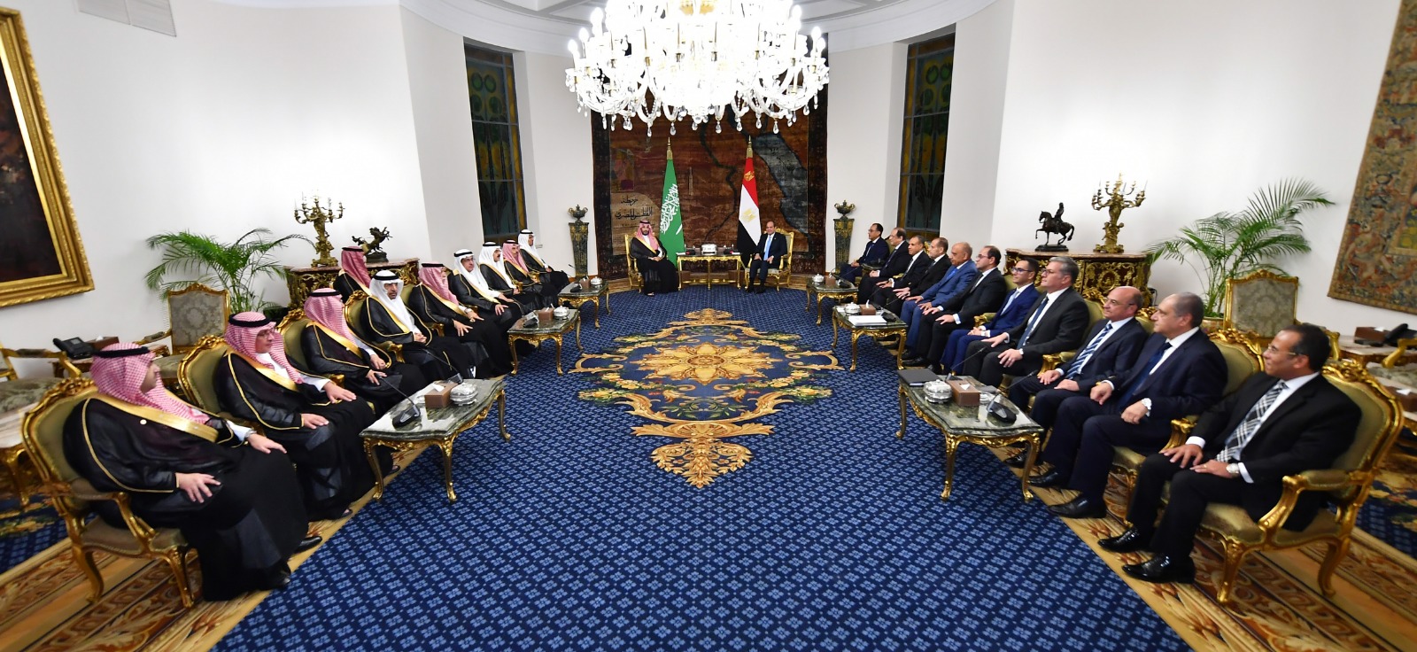 وقد أجرى الزعيمان لقاءً ثنائيًا، أعقبته جلسة مباحثات موسعة بحضور الدكتور مصطفى مدبولي رئيس مجلس الوزراء ووفدي البلدين، حيث رحب الرئيس بسمو الأمير محمد بن سلمان، معربًا عن أطيب تحياته لأخيه جلالة الملك سلمان بن عبد العزيز، خادم الحرمين الشريفين، ومشددًا في هذا السياق على عمق ومحورية العلاقات الاستراتيجية بين مصر والسعودية، لاسيما في ظل التهديدات التي تواجه المنطقة، ومؤكدًا أهمية مواصلة التنسيق والتعاون المشترك، لتجاوز المرحلة الدقيقة الحالية التي تمر بها منطقتنا وعالمنا الإسلامي، ومشيرًا إلى الحرص المتبادل على ترجمة العلاقات والروابط التاريخية بين البلدين، من خلال تعزيز الآليات الثنائية المؤسسية، وخاصة من خلال تدشين مجلس التنسيق الأعلى المصري السعودي برئاسة الرئيس وولي العهد السعودي، لمتابعة مختلف أوجه العلاقات الثنائية وسبل تطويرها باستمرار.