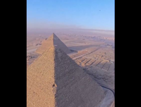 وأظهر المقطع، الذي بثه السائح، وانتشر بشكل كبير في الساعات الأخيرة، وجو كلبًا فوق قمة الهرم الأكبر، الذي يبلغ ارتفاعه نحو 150 مترًا.