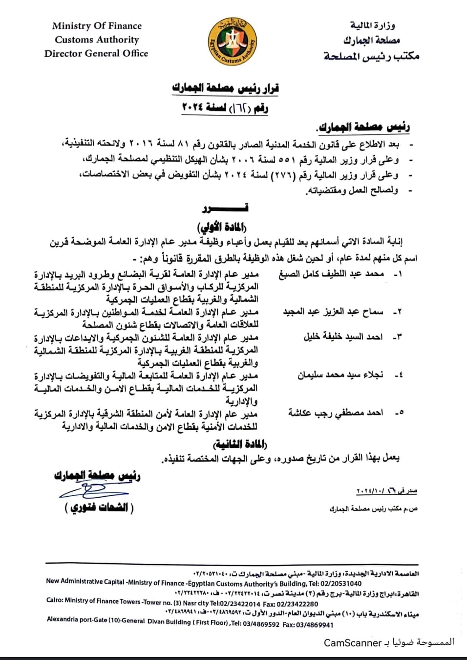 رئيس الجمارك يقرر إنابة عدد من قيادات المصلحة بوظيفة مدير عام الإدارة العامة
