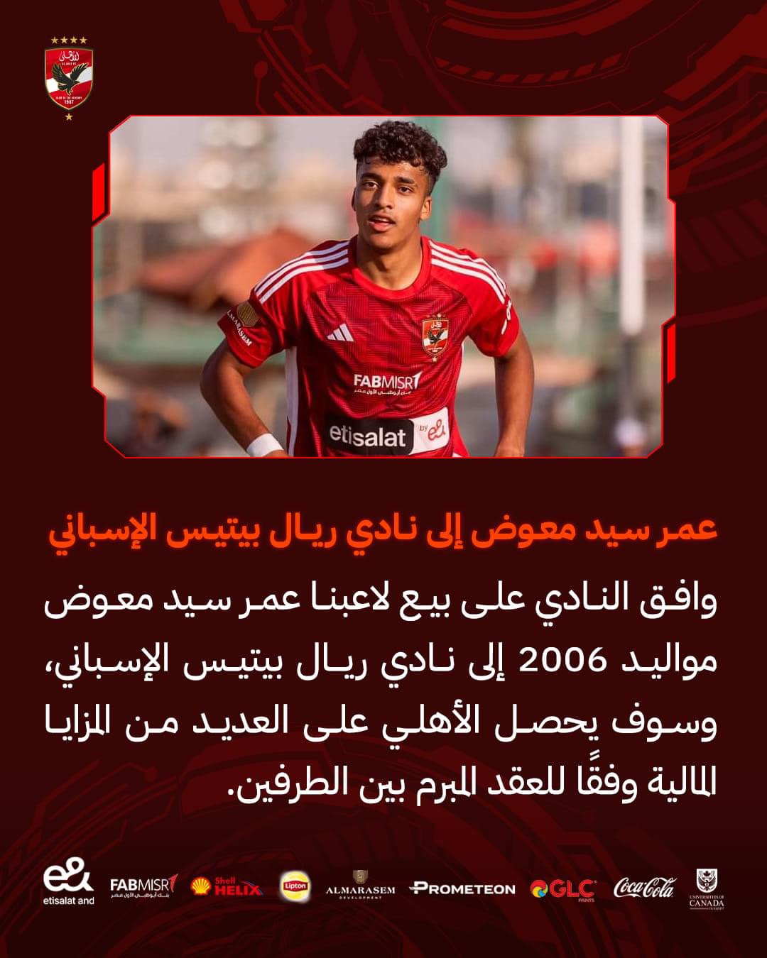 وجاء بيان الأحمر كالتالي: “ وافق الأهلي على بيع عمر سيد معوض لاعب مواليد 2006 إلي نادي ريال بيتيس الإسباني، وسوف يحصل الأهلي علي العديد من المزايا المالية وفقا للعقد المبرم”.